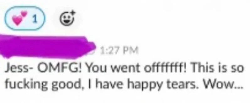 Text message conversation showing excitement and happiness, saying 'Jess- OMFG! You went offfffff! This is so good, I have happy tears.'
