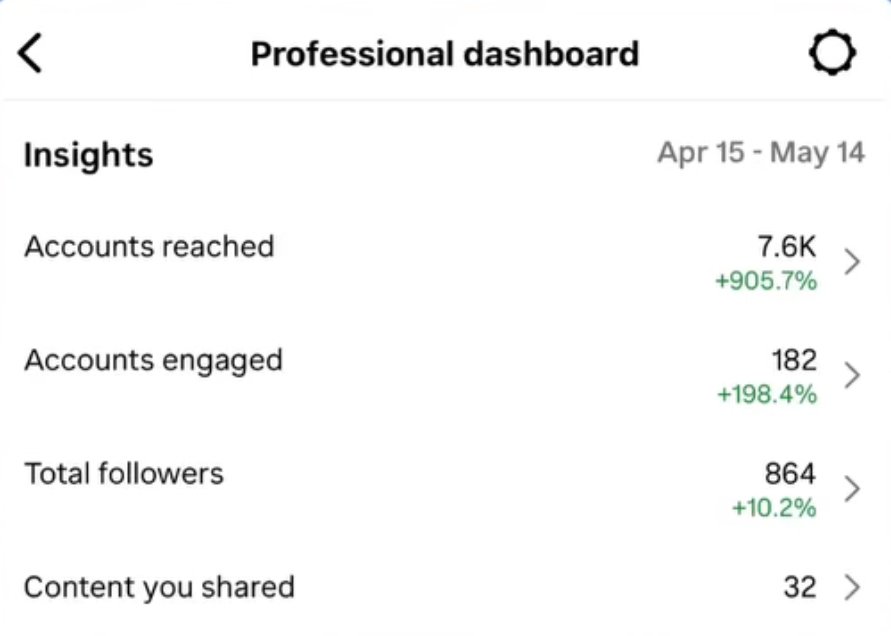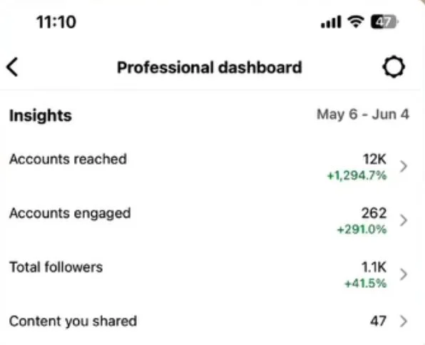 Screenshot of a professional dashboard showing insights from May 6 to June 4, including accounts reached, engaged, total followers, and content shared.