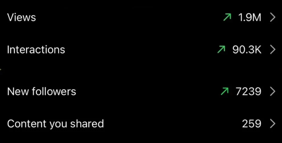 Screenshot of social media analytics showing that views, interactions, and new followers increased, with specific numbers provided.