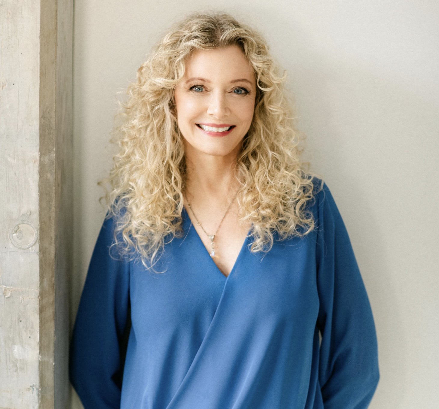 A smiling woman with curly blonde hair standing next to a concrete wall, wearing a blue blouse and a necklace.