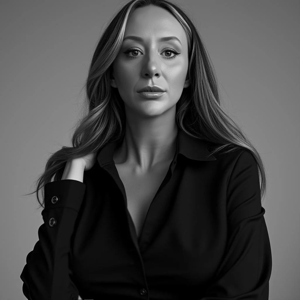 A black and white portrait of a woman with long, wavy hair, wearing a button-up shirt, looking directly at the camera with a neutral expression.