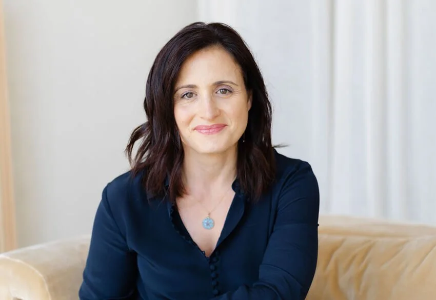 A woman with dark brown hair, wearing a navy blue blouse and a necklace, sitting on a beige sofa in a well-lit room with white curtains.