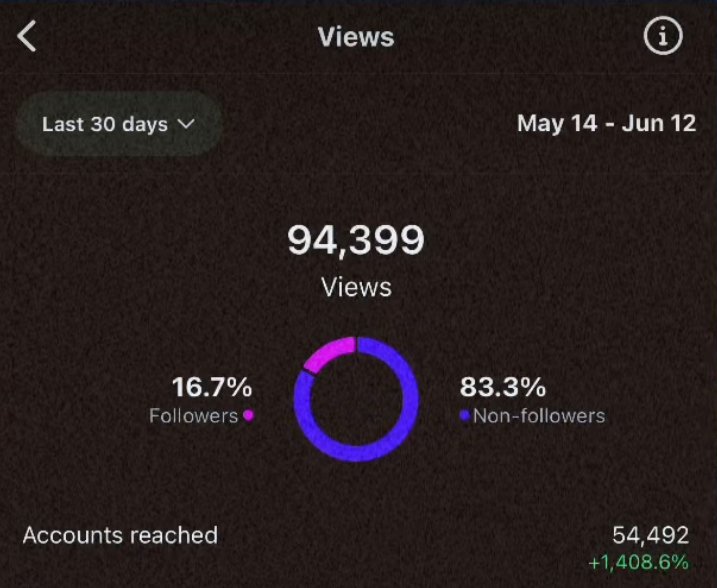 Social media analytics showing 94,399 views over the last 30 days from May 14 to June 12, with a pie chart indicating 16.7% followers and 83.3% non-followers, reaching 54,492 accounts with a 1,408.6% increase.