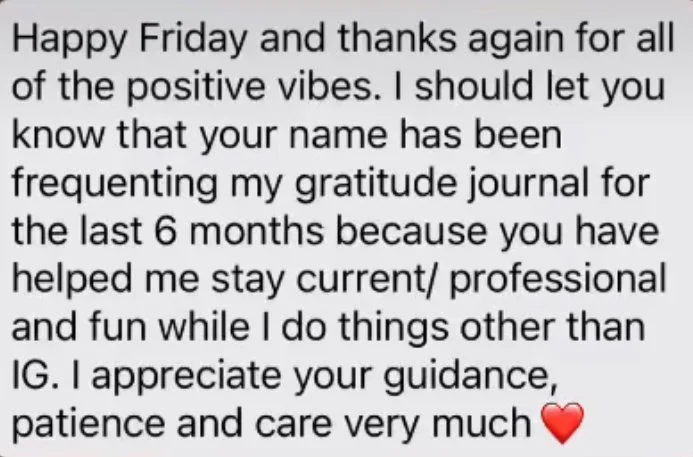 Text message saying, 'You are doing so amazing! I am so thankful I found you!' followed by a red heart emoji.