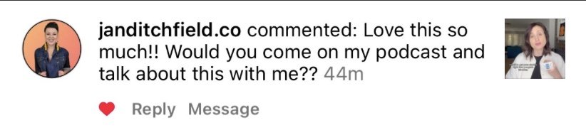Screenshot of a social media comment from janditchfield.co asking if someone would come on the podcast to talk about a certain topic, with a profile picture of a woman with dark hair and a white shirt.
