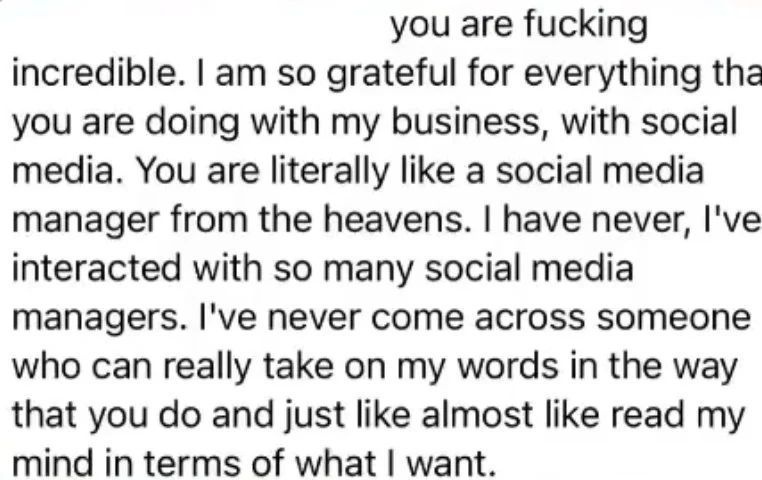 A screenshot of a message expressing gratitude and admiration for someone else's social media management skills.
